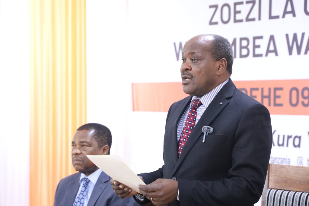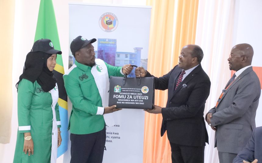 Mwenyekiti wa Tume Huru ya Taifa ya Uchaguzi, Mhe. Jaji wa Mahakama ya Rufaa Jacobs Mwambegele akimkakabidhi mkoba wenye fomu za kuomba kuteuliwa kuwa Mgombea wa Kiti cha Rais na Makamu wa Rais wa Jamhuri ya Muungano wa Tanzania kupitia tiketi ya Chama cha Makini (MAKINI), Mhe. Coster Jimmy Kibonde. Mgombea huyo wa MAKINI aliambatana na Mgombea Mwenza, Mhe. Aziza Haji Suleiman (kushoto) alichukua fomu hizo leo Agosti 10, 2025 ambapo Tume inataraji kufanya uteuzi Agosti 27 mwaka huu. Kualia ni Mkurugenzi wa Uchaguzi wa Tume, Ndg. Ramadhan Kailima. (Picha na INEC).